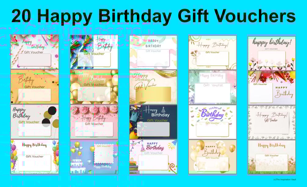 This package contains 1 pdf with 20 different beautiful printable Happy Birthday gift vouchers.
